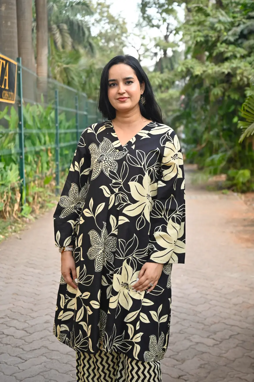 Easy, airy, and made for everyday comfort—this loose-fit cotton kurta with loose fit Pant is designed to suit all body types with ease. Crafted from 100% breathable cotton, it features a vibrant all-over print that feels light and effortless to wear.